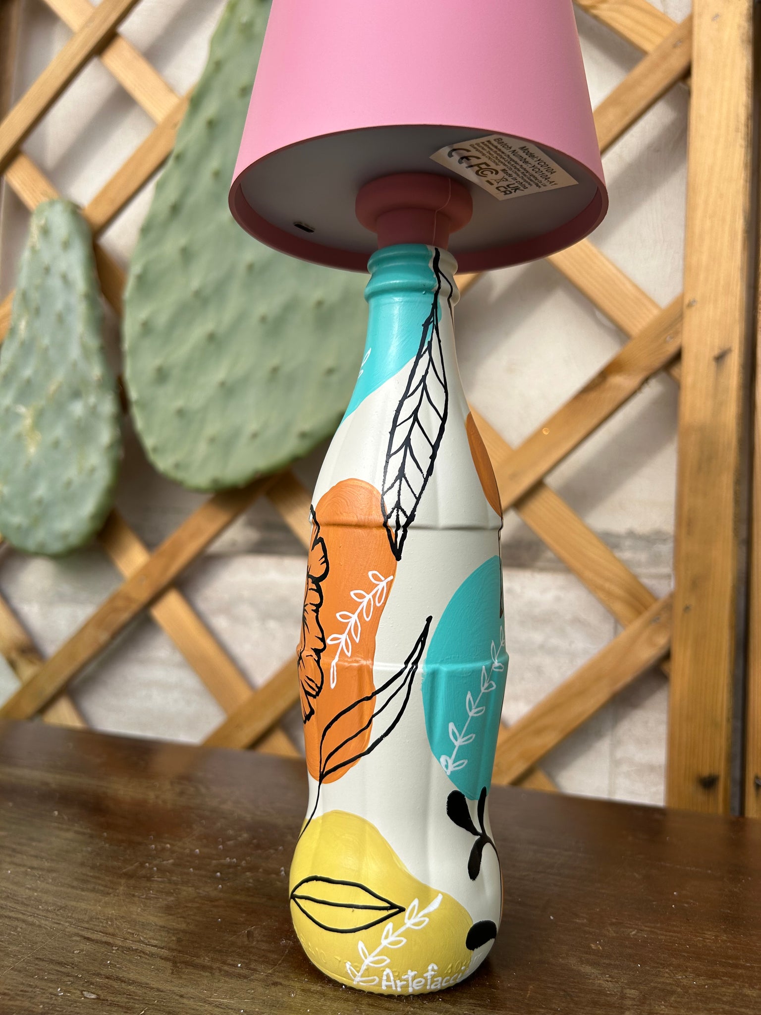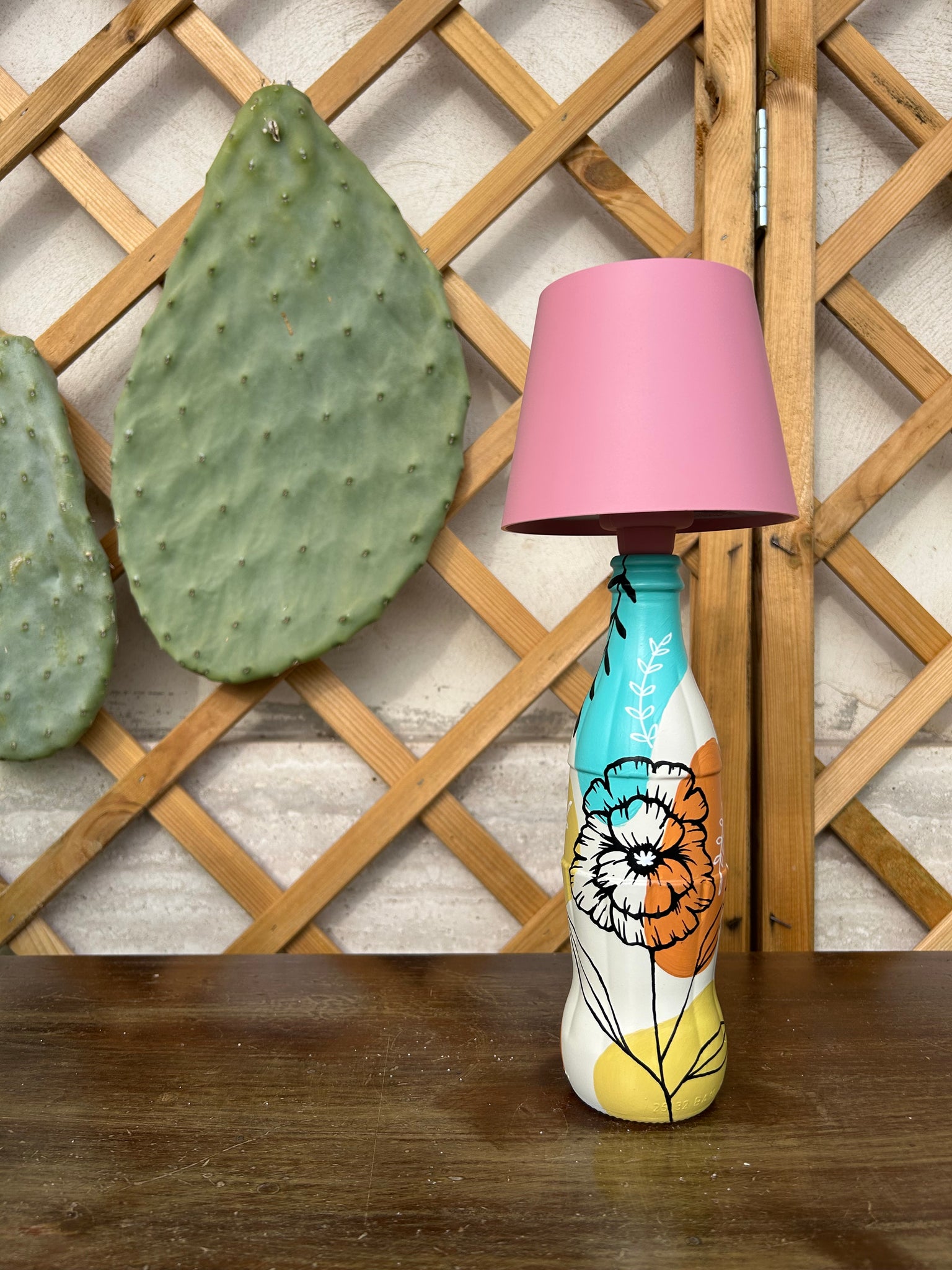 Gioia è composta dai colori senape, arancio e tiffany. Il paralume è rosa.