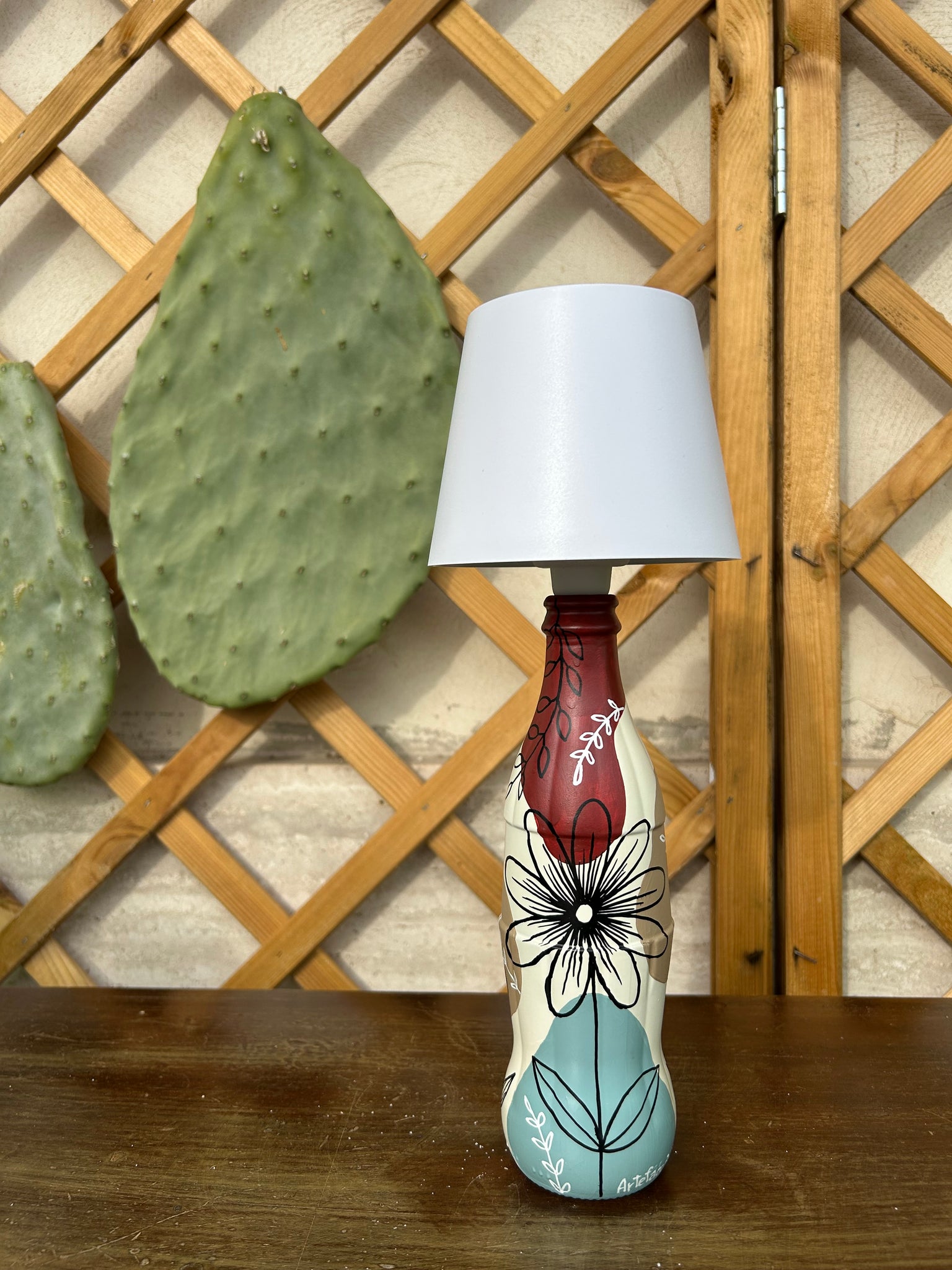 Sara è composta dai colori celeste cenere, cammello, vin brulè. Il paralume è bianco.