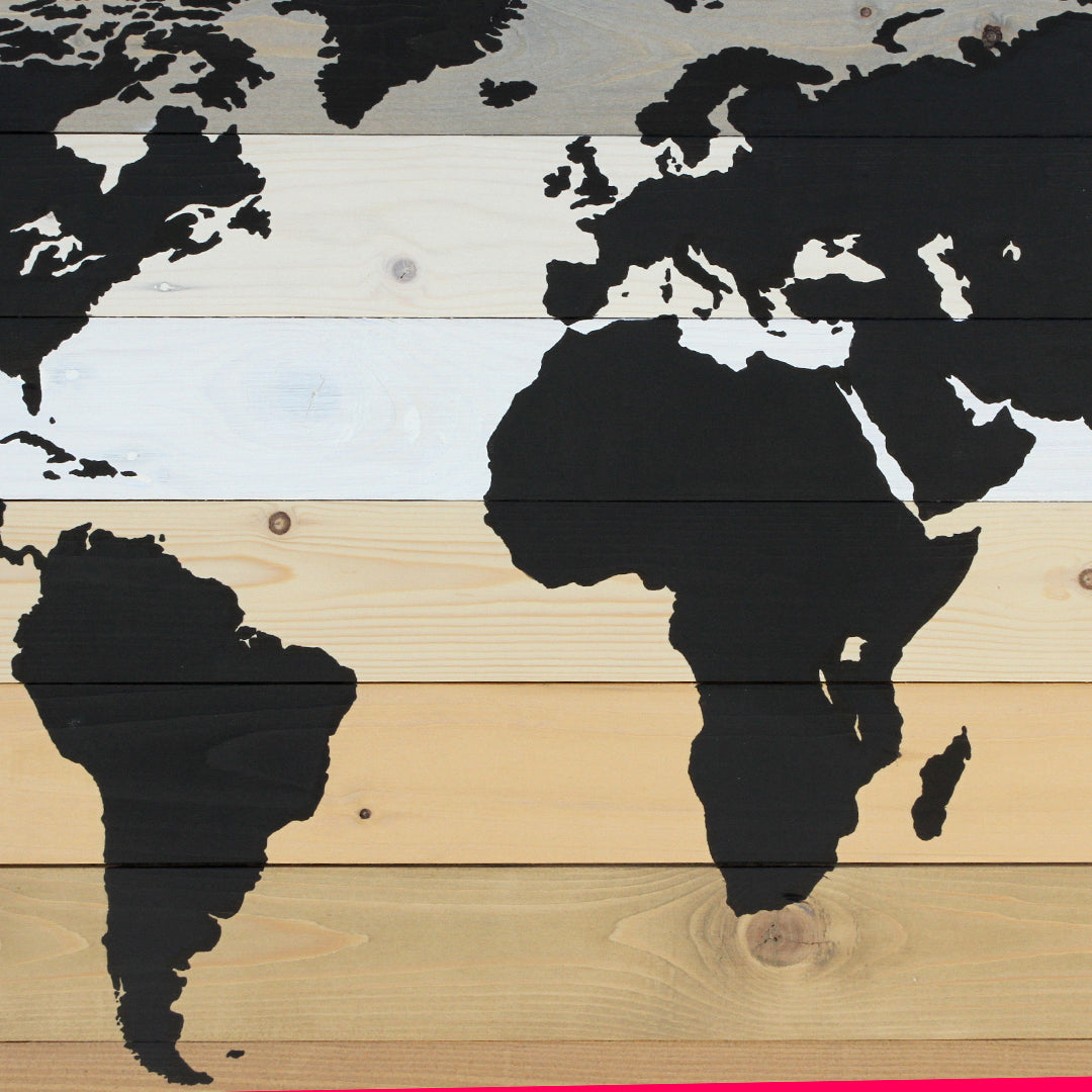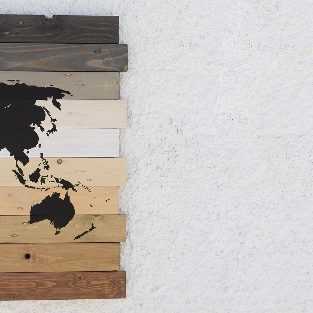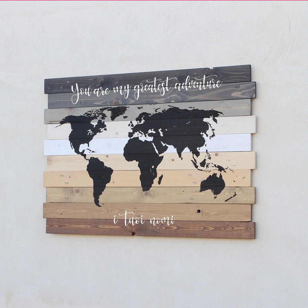 Ogni pezzo è unico perché realizzato con legno rigorosamente recuperato da pallet arrivati a fine vita. Smontiamo i pallet pezzo per pezzo, recuperiamo il legno ancora integro, tagliamo e levighiamo le assi recuperate, le trattiamo con vernici a base d’acqua, naturale ed ecologica e infine le trasformiamo in elementi d’arredo: pezzi unici e completamente artigianali. Le mappe e  le personalizzazioni sono fatte rigorosamente a mano.