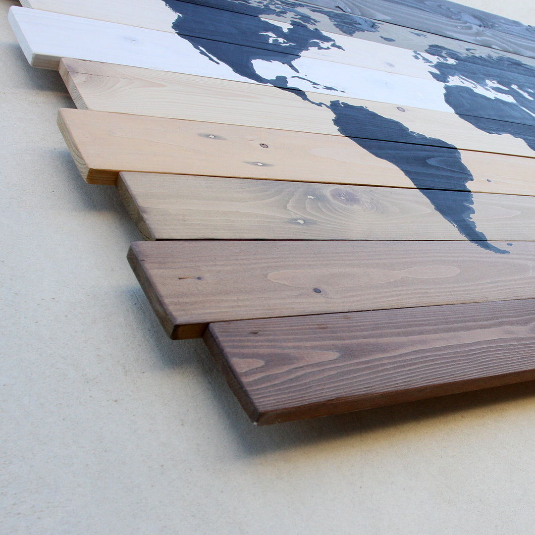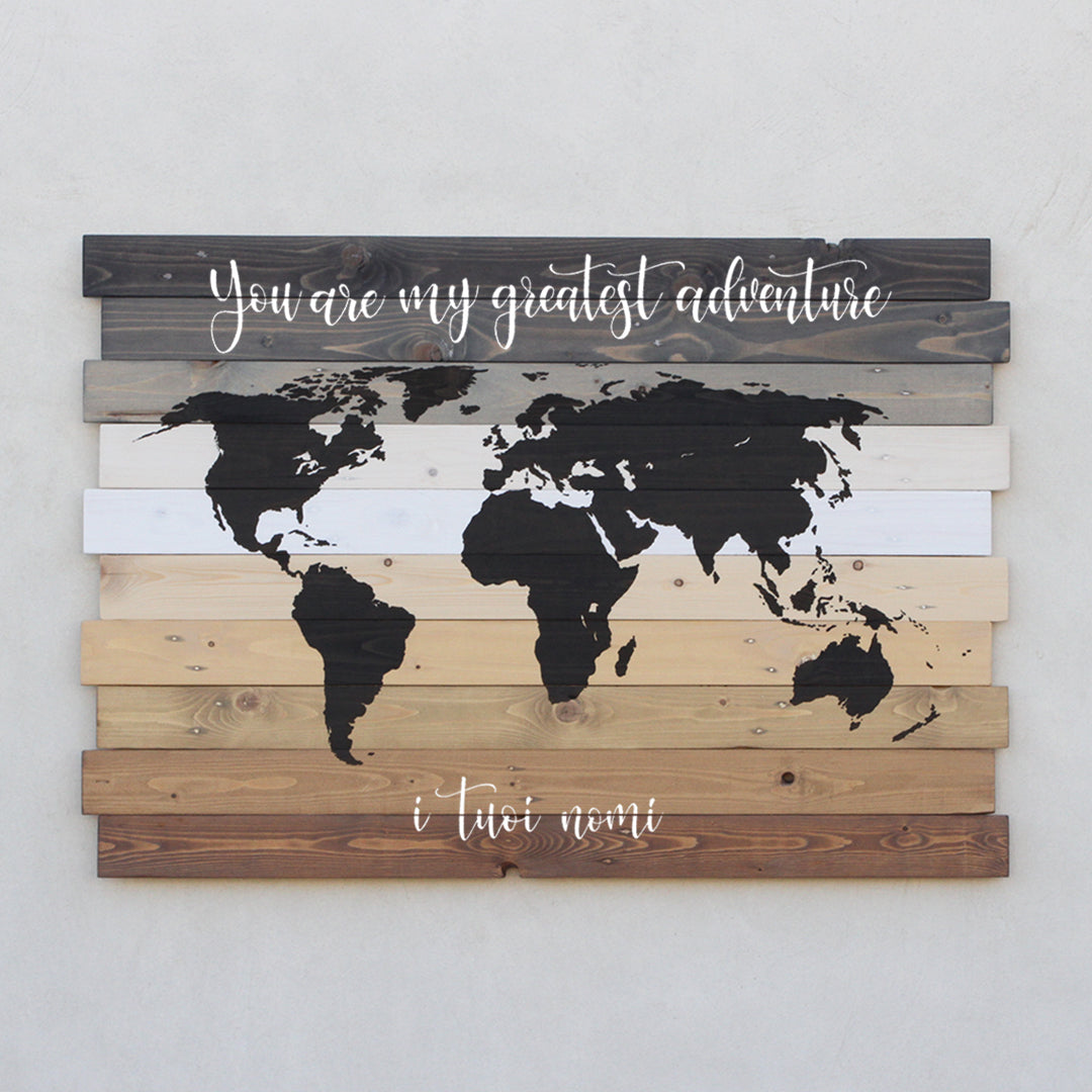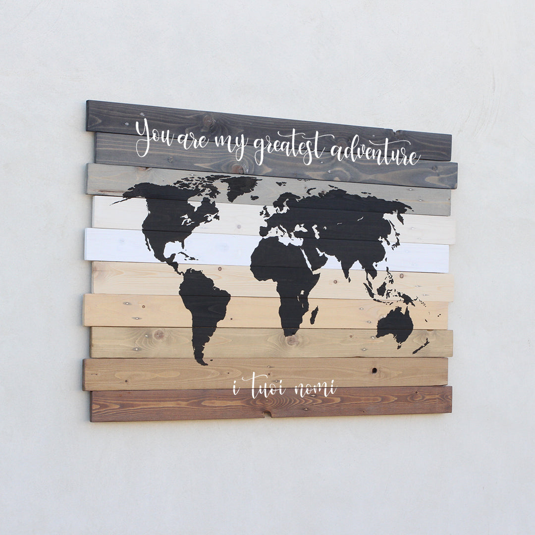 Ogni pezzo è unico perché realizzato con legno rigorosamente recuperato da pallet arrivati a fine vita. Smontiamo i pallet pezzo per pezzo, recuperiamo il legno ancora integro, tagliamo e levighiamo le assi recuperate, le trattiamo con vernici a base d’acqua, naturale ed ecologica e infine le trasformiamo in elementi d’arredo: pezzi unici e completamente artigianali. Le mappe e  le personalizzazioni sono fatte rigorosamente a mano.