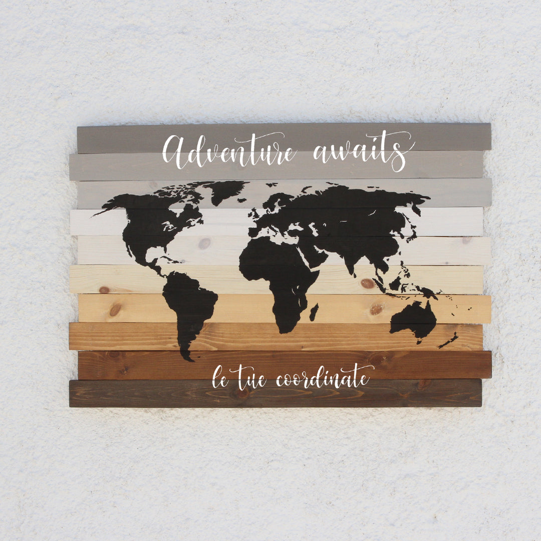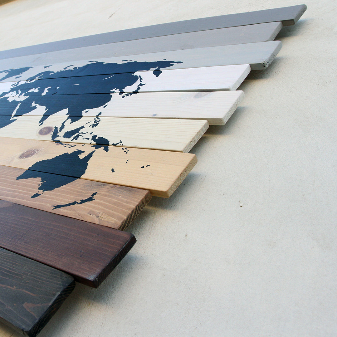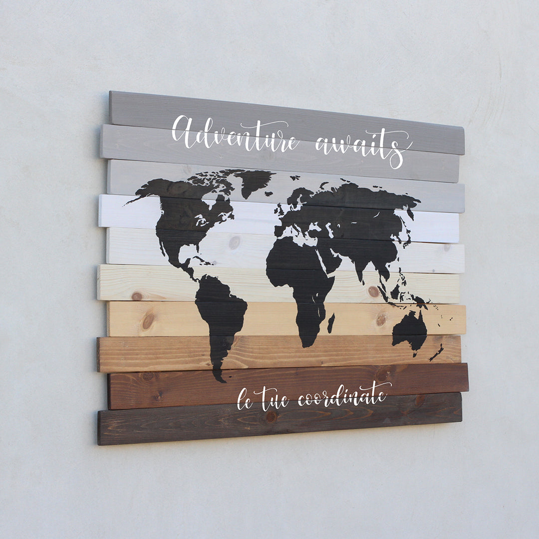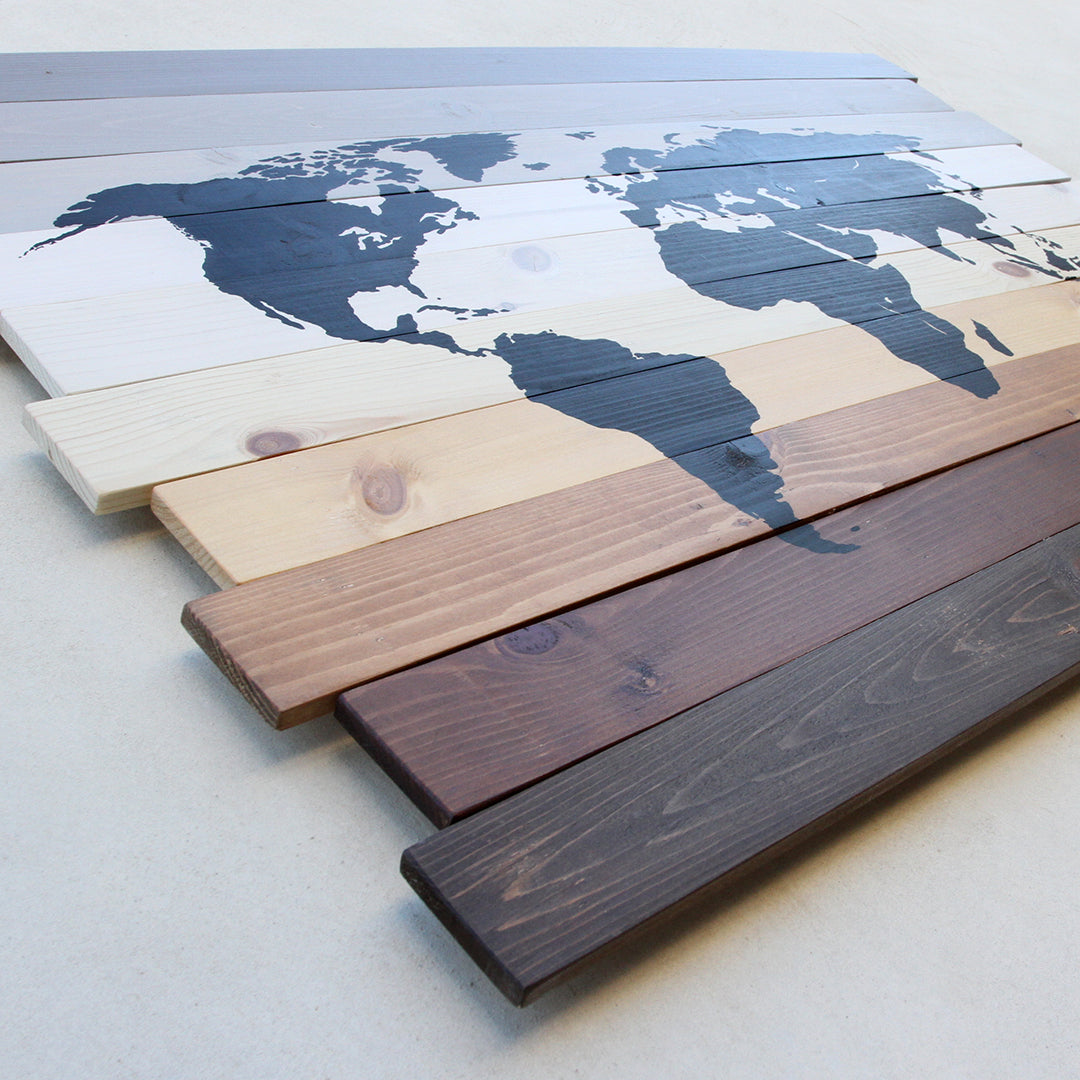 Ogni pezzo è unico perché realizzato con legno rigorosamente recuperato da pallet arrivati a fine vita. Smontiamo i pallet pezzo per pezzo, recuperiamo il legno ancora integro, tagliamo e levighiamo le assi recuperate, le trattiamo con vernici a base d’acqua, naturale ed ecologica e infine le trasformiamo in elementi d’arredo: pezzi unici e completamente artigianali. Le mappe e le personalizzazioni sono fatte rigorosamente a mano.