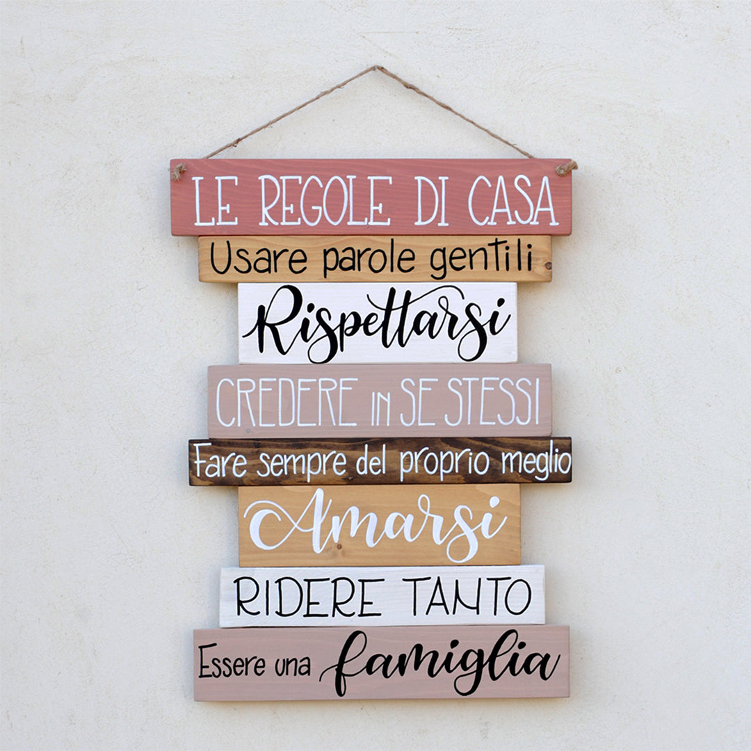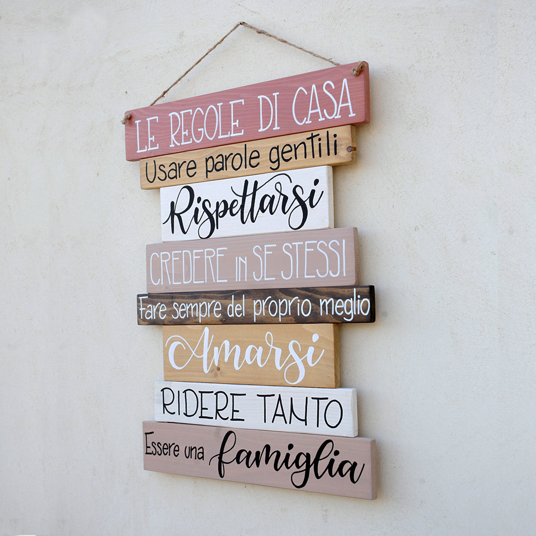Le regole di casa sono realizzate in 6 abbinamenti di colore: noce/tortora, noce/ petrolio, grigio/fumè, nero/grigio, rovere/rosa antico e azzurro santorini. Le tele sono formate da listelli di legno su cui decoriamo con l'antica tecnica dell'hand lettering le frasi scelte. Anche le scatole d’imballo sono fatte di cartone 100% recuperato.