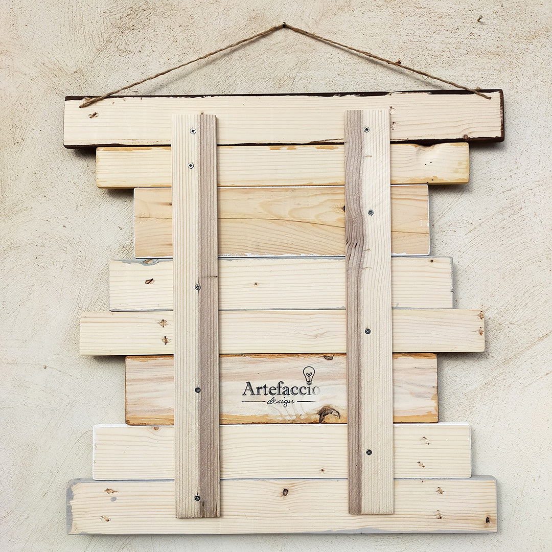 Ogni pezzo è unico perché realizzato con legno rigorosamente recuperato da pallet arrivati a fine vita. Smontiamo i pallet pezzo per pezzo, recuperiamo il legno ancora integro, tagliamo e levighiamo le assi recuperate, le trattiamo con vernici a base d’acqua, naturale ed ecologica e infine le trasformiamo in elementi d'arredo unici e completamente artigianali.