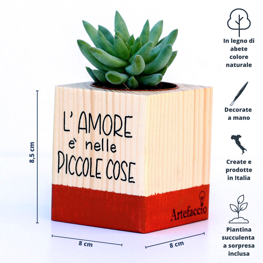I succulenti sono oggetti d'arredo a forma di cubo in legno di abete con all'interno una vera piantina succulenta di cui prendersi cura.